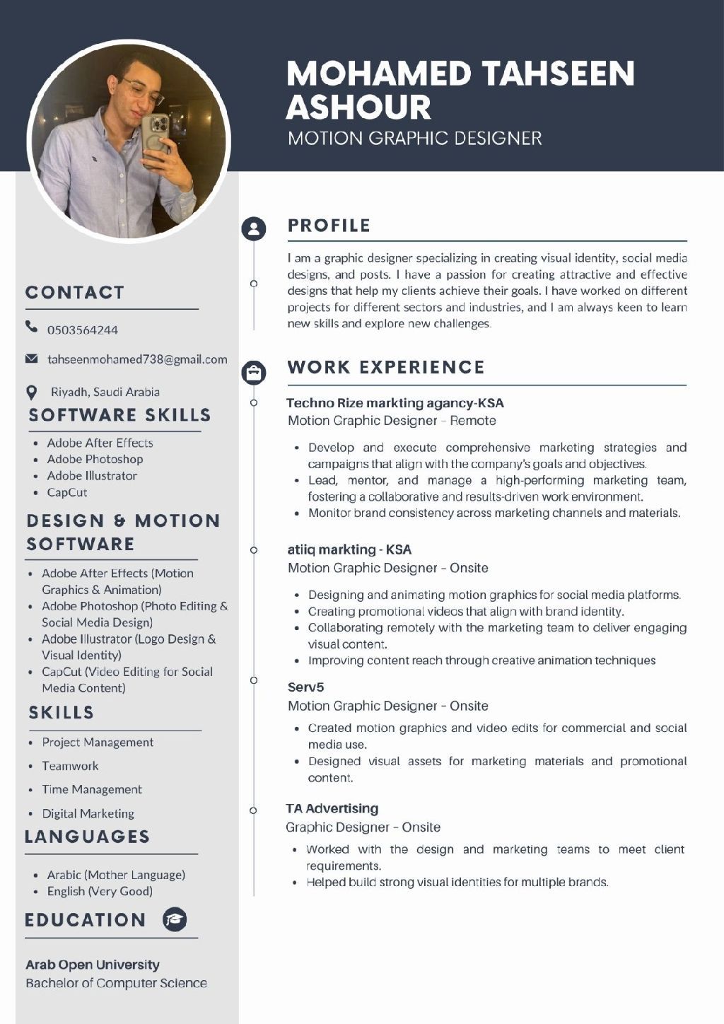 أنا مصمم جرافيك وموشن جرافيك محترف بخبرة عملية في تنفيذ فيديوهات اعلانية، محتوى سوشيال ميديا، وهويات بصرية. اعمل على تقديم محتوى ابداعي يجمع بين الفكرة القوية امتلك خبرة ثلاث سنوات في العمل مع شركات وفرق عمل داخل وخارج المملكة، سواء عن بعد أو من مقر العمل، لمهارات والأدوات Adobe After Effects Adobe Photoshop Adobe Illustrator CapCut متواجد حاليا في الرياض