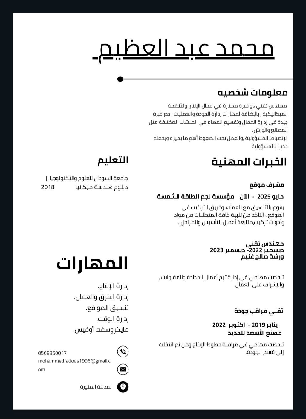 مهندس تقني ميكانيكا انتاج سوداني الجنسية ذو خبرة في مجال الانتاج والأنظمة الميكانيكية وضبط الجودة وإدارة العمل وتقسيم المهام ومصمم ومشغل سي أن سي راوتر أجيد جميع مكاين الخشب البيم سوا والبورنغ والشريط أل CV مرفق صورة