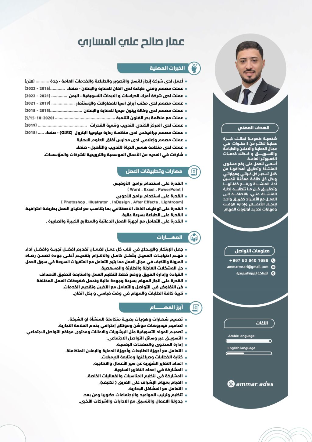 مصمم جرافيك محترف خبرة في الهوية البصرية والتواصل الاجتماعي جاهز للعمل أنا مصمم جرافيك شغوف ومبدع امتلك خبرة لأكثر من 8 سنوات في تحويل الأفكار الى واقع بصري جذاب. ابحث عن فرصة عمل (عن بعد أو دوام كامل) أساهم من خلالها في تطوير الهوية البصرية والدعائية والاعلامية والمحتوى التسويقي لشركتكم أو مؤسستكم الموقرة وزيادة تفاعل جمهوركم