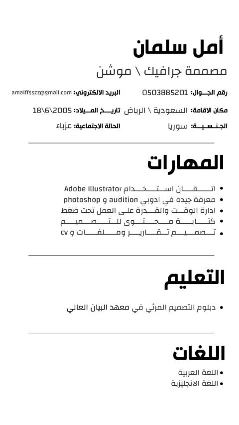 الاسم أفنان سعيد المسمى الوظيفي مصممة جرافيك (Graphic Designer) الملخص المهني مصممة جرافيك مبتدئة طموحة، حاصلة على درجة البكالوريوس في تخصص الملتميديا والجرافيك ديزاين، امتلك خبرة عملية لمدة 4 أشهر في تصميم المحتوى البصري. امتاز بالقدرة على تحويل الأفكار الى تصاميم جذابة تخدم الهوية البصرية