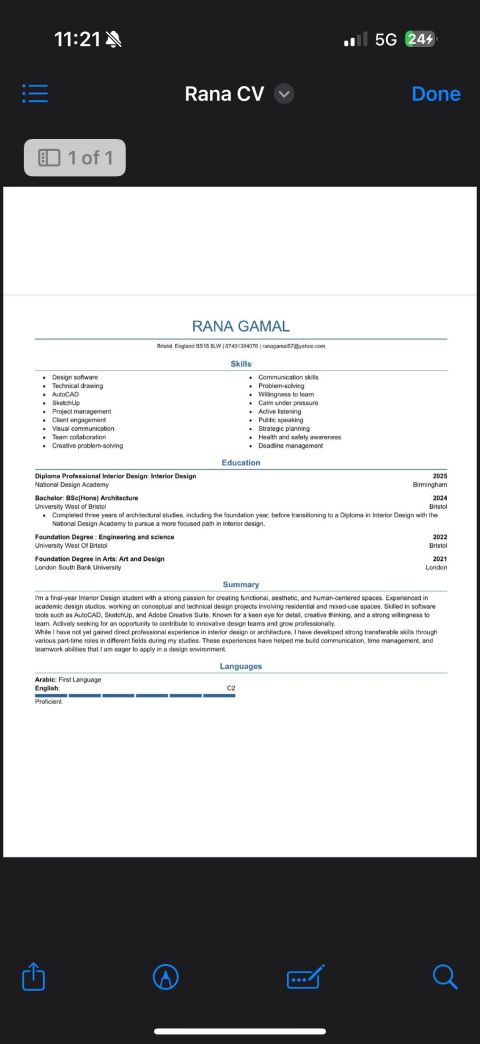 I am Rana 24 years old a fresh graduate of a diploma in interior design from the national design academy based in Birmingham and Dubai, I am looking for an interior design job opportunity. I can use AutoCAD SketchUp and Microsoft office. I am fluent in English and speak Arabic as my native language. I have residency in Saudi. please call me up for a job opportunity