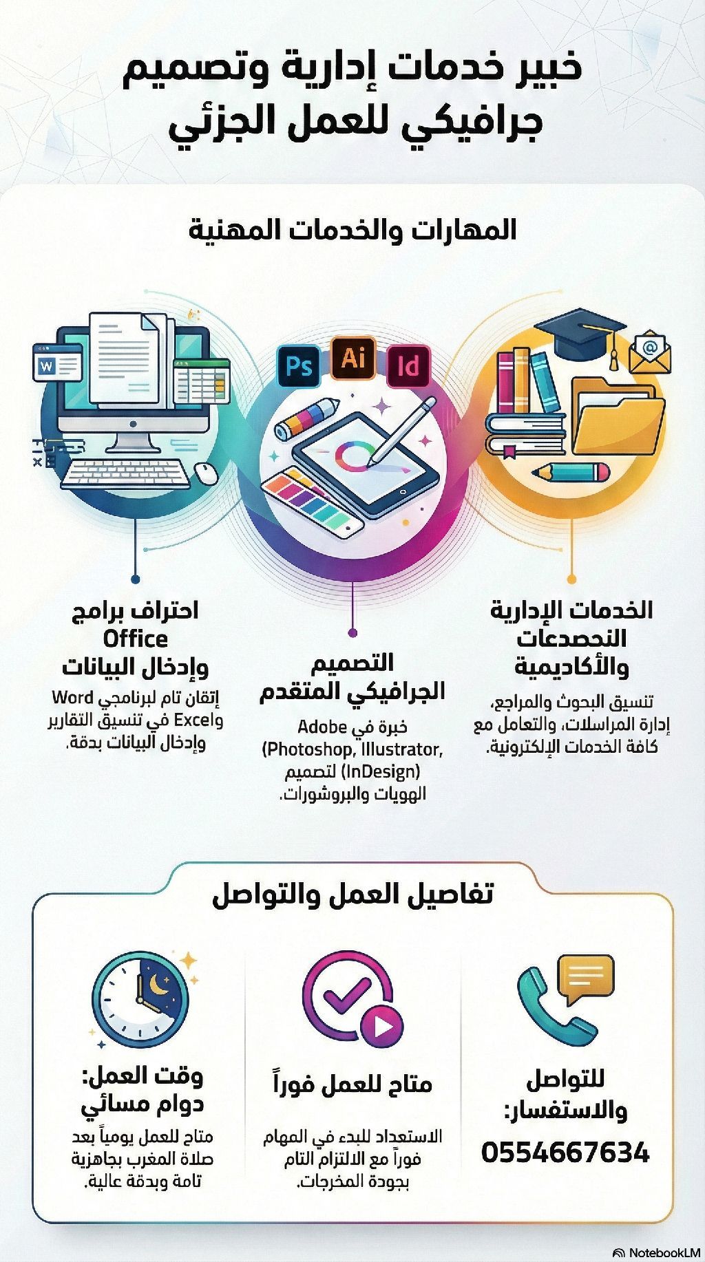 ابحث عن فرصة عمل جزئي (دوام مسائي - بعد صلاة المغرب) حيث أضع خبرتي الطويلة في المجالات التالية بين أيديكم برامج الأوفيس احتراف تام في (Word, Excel) وادخال البيانات وتنسيق التقارير. التصميم الجرافيكي خبرة في حزمة أدوبي (Photoshop, Illustrator, InDesign) لتصميم الهويات، البروشورات، والمنشورات. خدمات الطالب تنسيق البحوث، المراجع، والتعامل مع كافة الخدمات الإلكترو