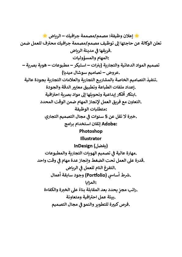 تعلن وكالة دعاية واعلان في الرياض حي الضباط عن وظيفة مصمم / مصممة جرافيك تنفيذ التصاميم الخاصة بالمشاريع التجارية والعلامات التجارية بجودة عالية. ابتكار أفكار ابداعية وتحويلها الى مواد بصرية احترافية. التعاون مع فريق العمل لانجاز المهام ضمن الوقت المحدد. متطلبات الوظيفة خبرة لا تقل عن 5 سنوات في مجال التصميم التجاري. اتقان استخدام برامج Adobe Photoshop - Illustrator InDesign