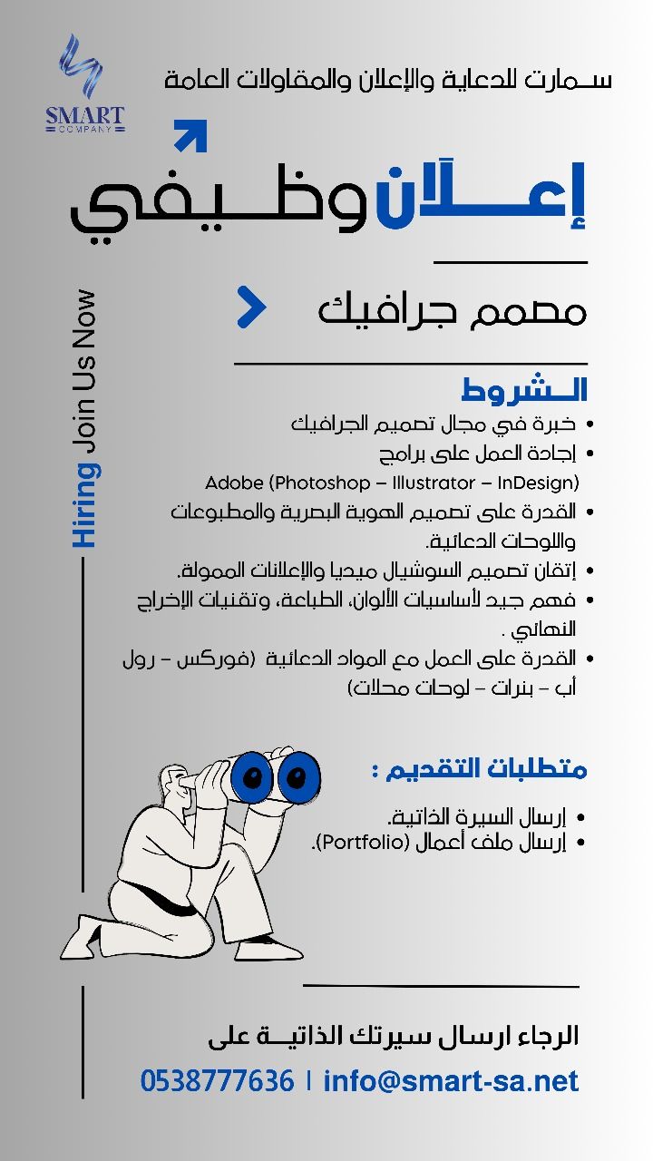 مطلوب مصمم أو مصممه حسب الشروط المرفقه بالاعلان للعمل حضوري في مقر الشركة - بمحافظة الخرج الرجاء التواصل وارفاق السيفي وملف الأعمال