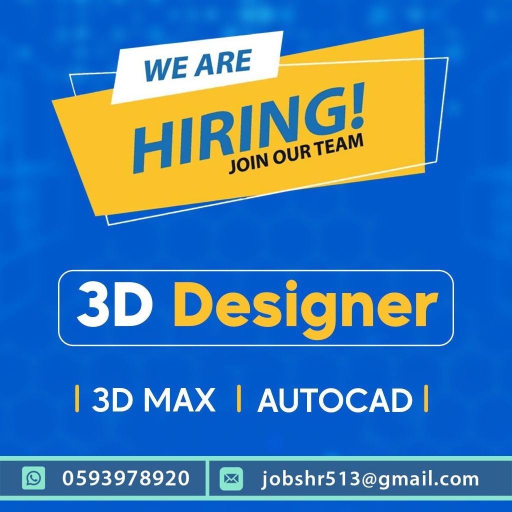 شركة كبري تعمل في مجال المعارض والمؤتمرات والدعاية والاعلان والانتاج الفني تبحث عن مصمم 3D يجيد استخدام برامج 3ds Max وAutoCAD وكل برامج أل 3D خبرة في تصاميم المعارض والمؤتمرات والفعاليات. الرياض حي الملقا