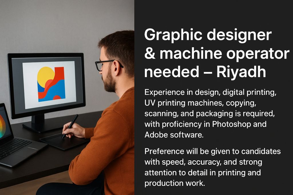 A graphic designer and machine operator are needed in Riyadh. Experience in design, digital printing, UV printing machines, copying, scanning, and packaging is required, with proficiency in Photoshop and Adobe software. Preference for candidates with speed, accuracy, and attention to detail. Send your CV and portfolio Riyadh Alolaya