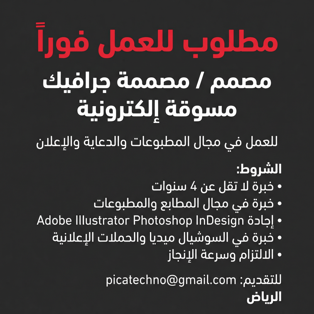 شركة متخصصة في الدعاية والاعلان في القادسية (المطبوعات الورقية واللوحات الاعلانية) تعلن عن حاجتها الى مصمم جرافيك محترف مصممة جرافيك محترفة مسوقة الكترونية محترفة الشروط خبرة لا تقل عن 4 سنوات خبرة سابقة في مجال المطابع أو الدعاية والاعلان اجادة برامج التصميم Adobe (للمصممين) المميزات راتب مجزي + حوافز + بيئة عمل احترافية للتقديم يرجى إرسال السيرة الذاتية + نماذج الأعمال على الموقع الرياض
