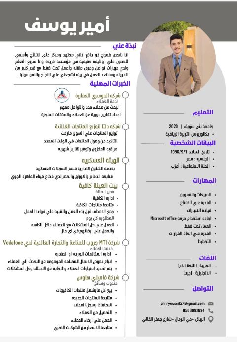 العمر 28 سنة خبرة 5 سنوات في ادخال البيانات وأيضا بعض القيود المحاسبية (محترف جدا) في أونكس برو وبرنامج أودو 5 سنوات في إدارة المخزون 3 سنوات في إدارة أسواق مركزية وشركات الجملة 3 سنوات في ادارة مشتريات 3 سنوات في إدارة العمليات منها اللوجستية 9 سنوات في برامج أوفيس الانجليزية جيدا