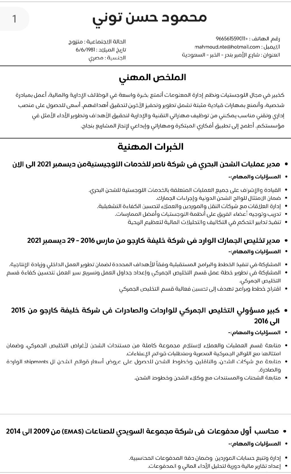 مدير تخليص جمركي، بخبرة عملية تزيد عن 15 عاما في لوجستيات الاستيراد والتصدير، والامتثال للوائح، والعمليات الجمركية في مصر والمملكة العربية السعودية. حاصل على شهادة معتمدة من مصلحة الجمارك المصري وماجستير في إدارة الأعمال يبحث عن عمل بوظيفة منسق لوجيستي. مدير تخليص جمركي. مشتريات وسلاسل توريد أخصائي شحن جوي وبحري