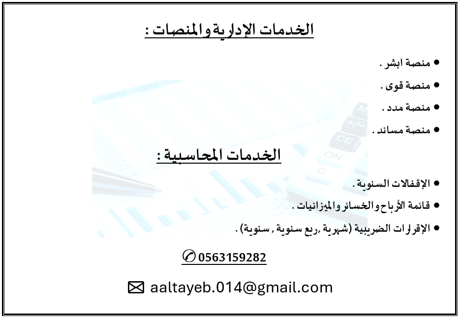 محاسب خبرة ابحث عن عمل عن بعد خدمات مالية ومحاسبية الإقفالات السنوية حسابات الأرباح والخسائر والميزانيات الاقرارات الضريبية خدمات عامة عن بعد التعامل مع المنصات الحكومية ابشر قوى مدد مساند أجير التأمينات الاجتماعية انجاز تأشير