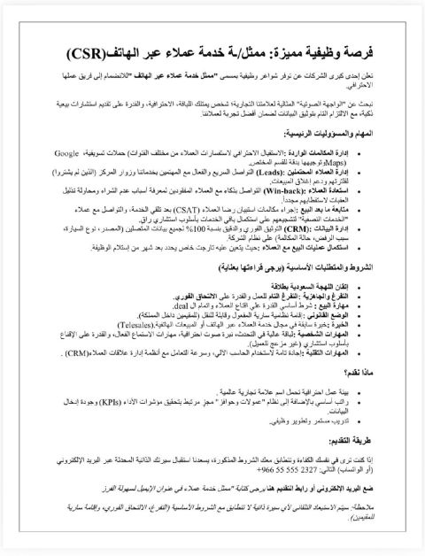 فرصة وظيفية مطلوب كول سنتر تنطبق عليه التفاصيل الموجودة في الصورة المرفقة. للتقديم، أرسل سيرتك الذاتية بعنوان "ممثل خدمة عملاء
