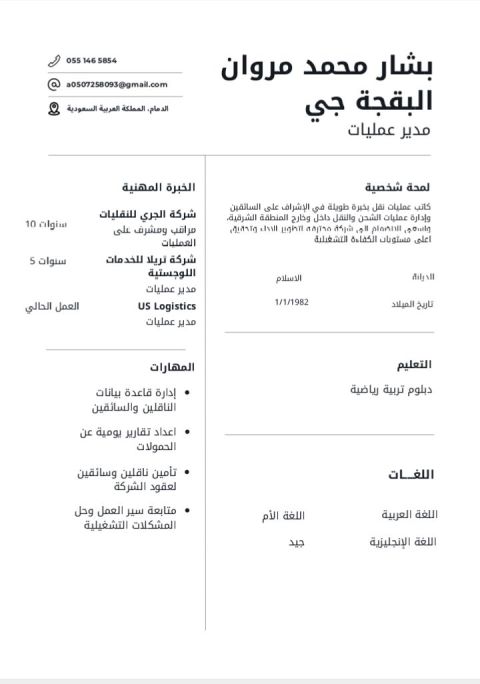 ابحث عن عمل في شركات النقل وشركات اللوجستية الجنسية / سوري المهنة / كاتب عمليات إقامة الدمام حي بدر لدي خبرة في مجال النقل البري ما يقارب 15 سنة في الدمام خبرة في مجال متابعه سيارات خبرة في جلب ناقلين وسائقين لجميع الطلبات والأحمال اليوميه خبرة في أداره واشراف السائقين ومتابعتهم خبرة في أداره فواتير ومتابعه التحصيل مع الشركات والمصانع تحمل جميع ضغط العمل فيما يخدم المصلحة العامة