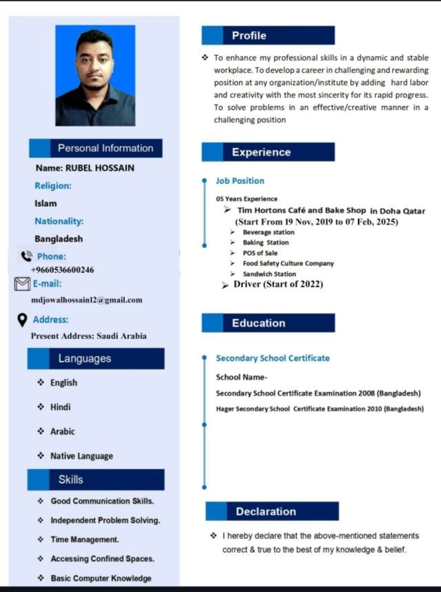 Sir/ Madam, My name is Rubel Hossain. I need a job. I want a Driving job. I have Saudi driving license and Qatar driving license. I have 5 Years experience Tim - hortons coffee shop in Qatar. Now I am in Saudi Arabia. I know Barista (coffee maker) cashier (POS) Baking. English language, Hindi language very good. Arabic - language good. Please help me