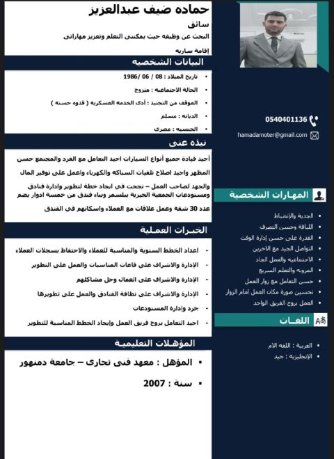 الاسم أحمد عسكر العمر 29 الجنسية مصري سائق خاص الإقامة سارية الرخصة سارية أنا أدور شغل في المنزل أو شركة أو أي شيء خبرة في سواقة السيارات الأوتوماتيك والعادي ملتزم والحمد لله