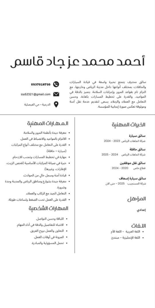 أنا سائق حافلات ونقل موظفين خبرة في باص كوستر وهايس. لديه الخبرات المد يده في العمل في المملكة. لديه إقامة سارية ورخصة قيادة سارية وأجيد التعامل مع العملاء