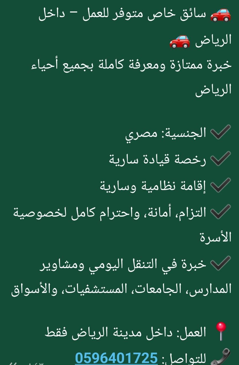 سائق خاص متوفر للعمل - داخل الرياض خبرة ممتازة ومعرفة كاملة بجميع أحياء الرياض الجنسية مصري رخصة قيادة سارية إقامة نظامية وسارية التزام، أمانة، واحترام كامل لخصوصية الأسرة خبرة في التنقل اليومي ومشاوير المدارس، الجامعات، المستشفيات، والأسواق العمل داخل مدينة الرياض فقط للتواصل