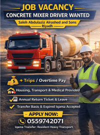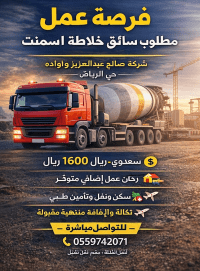 تعلن شركة Saleh Abdulaziz Alrashed & Sons Company عن توفر وظائف شاغرة بمسمى سائق خلاطة للانضمام الى فريق العمل. المزايا راتب أساسي 1600 ريال سعودي + بدل رحلات (Trip) سكن مؤمن مواصلات مؤمنة تأمين طبي تذكرة سفر سنوية المتطلبات رخصة قيادة سارية (سعودية) خبرة سابقة في قيادة الخلاطات (يفضل) الالتزام والانضباط في العمل للتقديم يرجى التواصل على الرقم