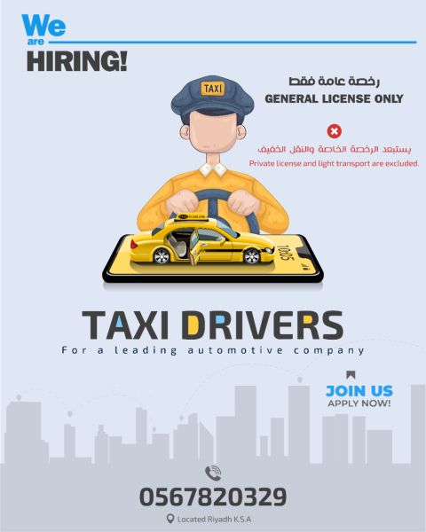 Taxi (limousine) drivers wanted for Sakhr Taxi Company. General driving license required (private license and light transport licenses are excluded) Applicants must be of the following nationalities Egyptian, Indian, and Bangladeshi. Apologies to applicants of other nationalities. Main location Riyadh, Khurais Road, Al Rabwah District, next to Arab Computers. Valid driver's license and residency