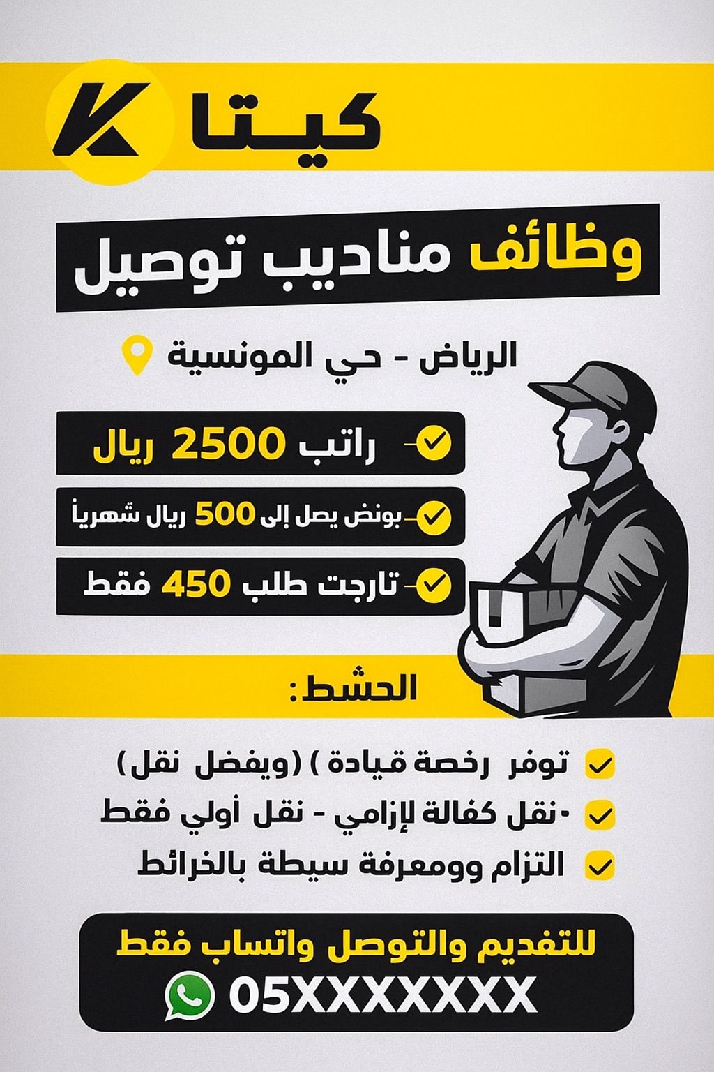 Serious delivery drivers needed to work in Al - Munsiyah district, Riyadh. Salary 2500 SAR, bonuses up to 500 SAR. Target 450 deliveries any delivery above the target is charged at 8 SAR extra. Valid residency permit and driver's license required. Light vehicle experience preferred. Transfer of sponsorship is mandatory. The company provides a car, fuel, accommodation, and internet