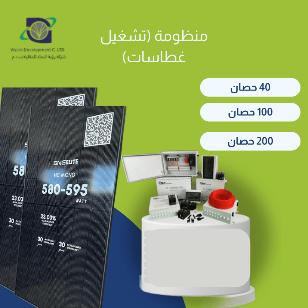 منظومة متكاملة لتشغيل غطاسات بقدرة 40 حصان - 100 حصان - 200 حصان تعمل بالكامل بالطاقة الشمسية مثالية للمزارع والآبار العميقة. نظام جاهز للتشغيل تقليل كبير في استهلاك الوقود والكهرباء مناسب للآبار الزراعية والمشاريع الكبيرة مكونات عالية الجودة (ألواح - انفرتر - هيكل - كابلات - حماية كاملة) المواصفات الأساسية القدرة 40 حصان 30 كيلوواط 100 حصان 75 كيلوواط 200 حصان 149 كيلوواط - التشغيل طاقة