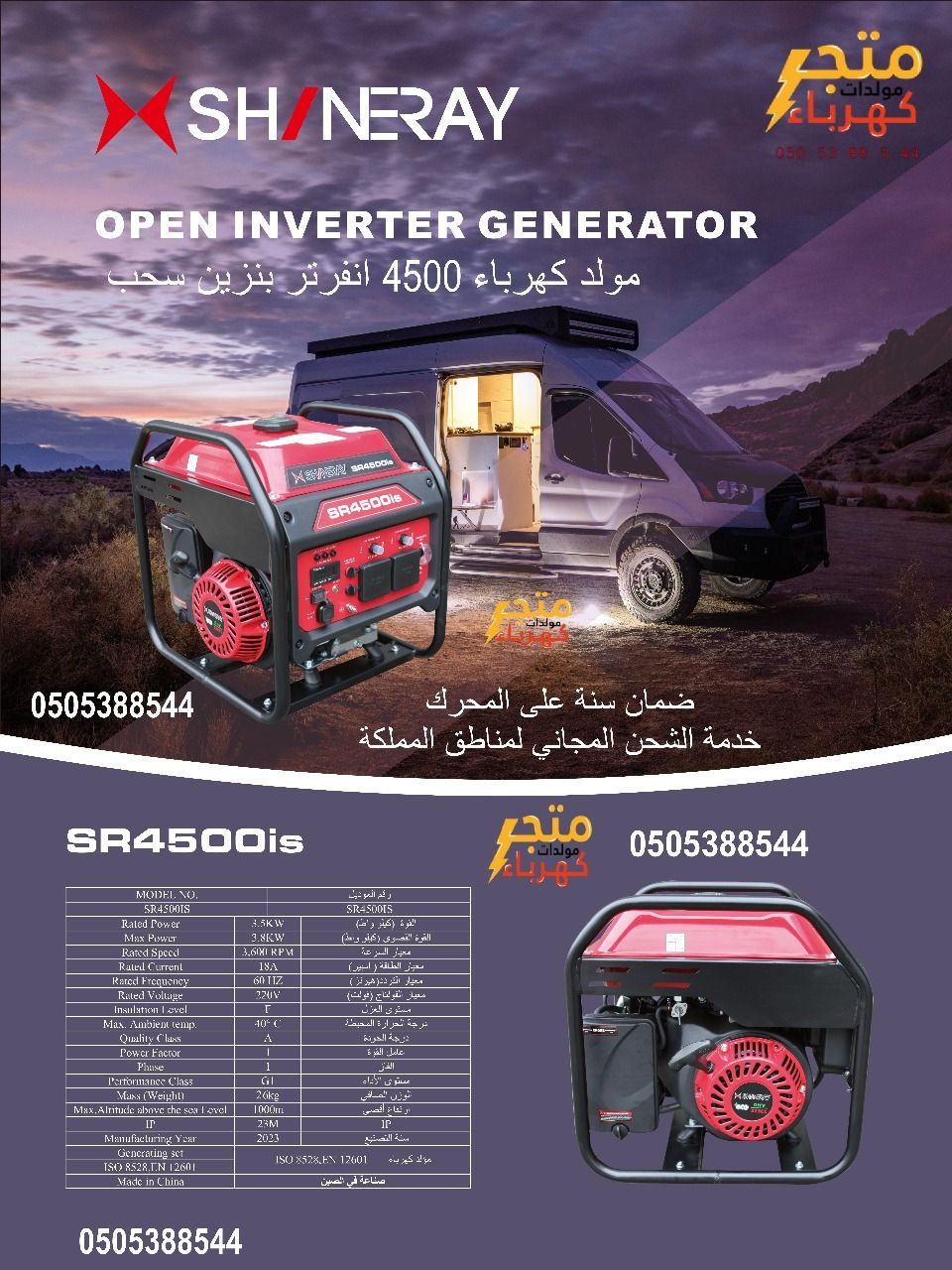 مولد كهرباء SR4500i بنزين شيناري يعمل بالسحب مناسب للمخيمات وأعمال البناء والمقاولات والتعمير القوة القصوى 3800 واط معدل القوة 3500 واط 220 فولت - 60 هيرتز الخزان 8 لتر ساعات العمل 50% تشغيل 10 ساعات 100% تشغيل 8 ساعات قطع الغيار متوفرة الشحن مجاني