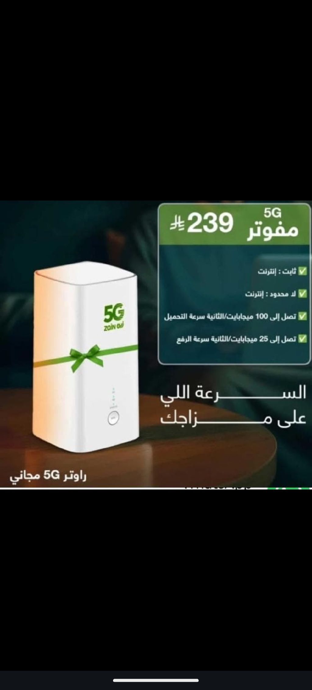 عرض خاص من زين 5g ألحق العرض قبل نفاذ الكمية أرخص وأقل سعر في المملكة العربية السعودية للسرعة المفتوحه تواصل واتساب (رقم الجوال يظهر عند الضغط على زر تواصل) باقة أل 239 بتكون معك نت مفتوح طول الشهر يعني استخدامك لا محدود بدون استخدام عادي يعني عيش براحتك أنت وحبايبك طول الشهر تفاصيل الباقة جهاز راوتر آخر اصدار من شركة زين مجانا انترنت لا محدود بدون سياسة الاستخدام العادل فترة تجربة