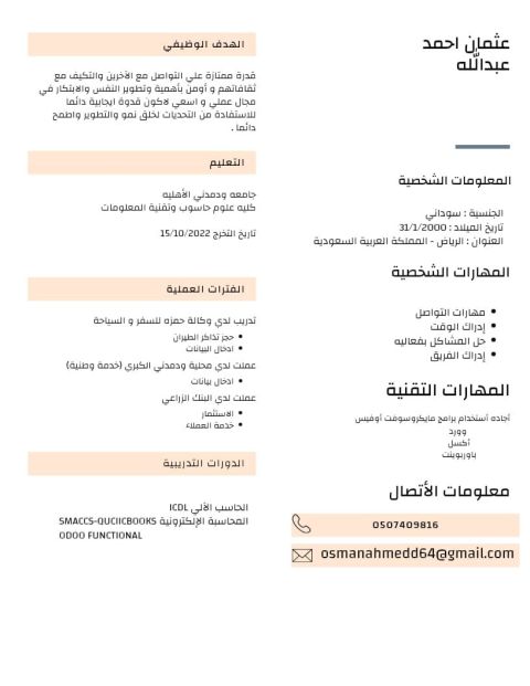 سوداني مقيم ب الرياض حاليا اعمل مندوب لدي stc Bank خريج بكالوريوس علوم حاسوب ابحث عن عمل أي مجال وليس لدي مشكلة أتعلم أشياء جديدة وأكون جزء من نجاح الشركة عملت تدريب لدي البنك الزراعي وعملت لدي محلية مدني الكبري وعملت لدي وكالة سفر وسياحة ولدي كورسات حاسب الى ومحاسبة الالكترونية وodoo functional