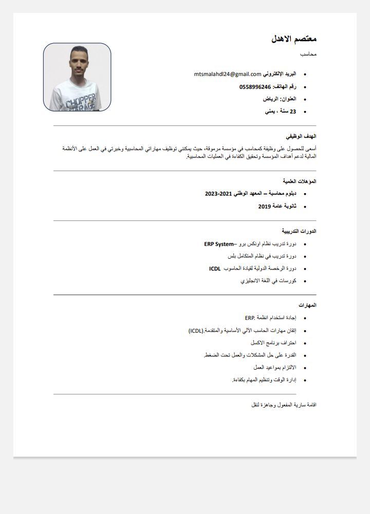 أنا محاسب حديث التخرج عندي خبرة سنة كنت اشتغل كمحاسب مالي ومخزني اشتغلت علي برنامج الأونكس والمتكامل وبرنامج الاكسل والوورد أعرف اعمل فواتير المبيعات والمشتريات بعمل مراقبه المخزون وقيود اليوميه وارصده العملاء والموردين والجرد كنت براجع التقارير المبيعات والمشتريات الشهريه