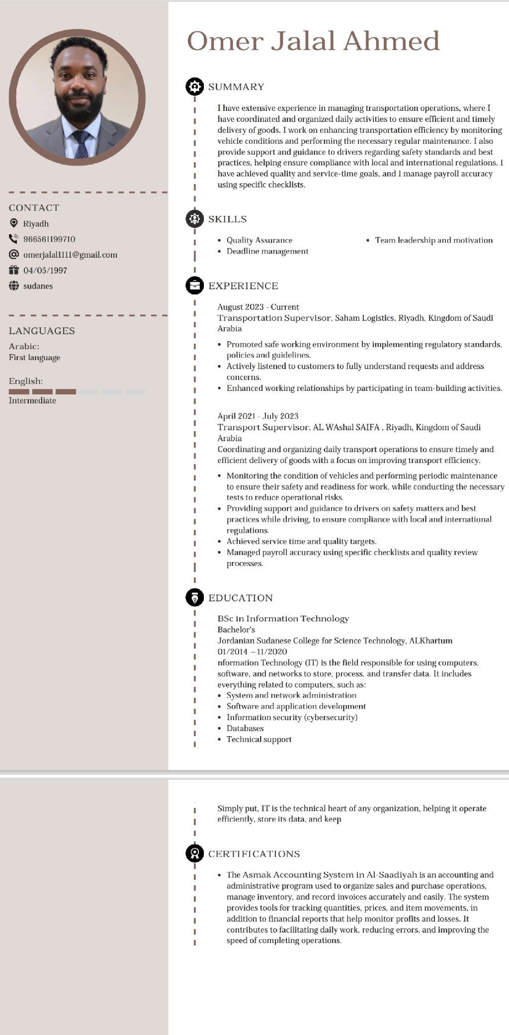 خريج بكالوريوس تقنية المعلومات لدي خبرة واسعة في إدارة عمليات النقل اعمل على تحسين كفاءة النقل من خلال مراقبة حالة المركبات وإجراء الصيانة الدورية اللازمة. كما أقدم الدعم والتوجيه للسائقين فيما يتعلق بمعايير السلامة وأفضل الممارسات مما يساعد على ضمان الامتثال للوائح المحلية والدولية لقد حققت أهداف الجودة ووقت الخدمة وأدير دقة الرواتب باستخدام قوائم مرجعية محددة. ولدي الخبرة ببرامج المايكروسوفت