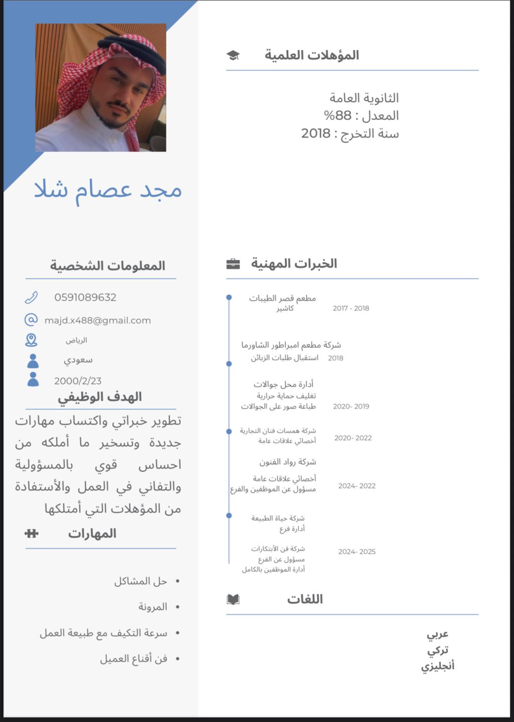 الوصف شاب سعودي طموح، عندي خبرة عملية قوية في العمل الميداني وإدارة المهام اليومية، اشتغل بعقلية التزام ومسؤولية، وأتعامل مع الشغل كأنه مشروعي الخاص