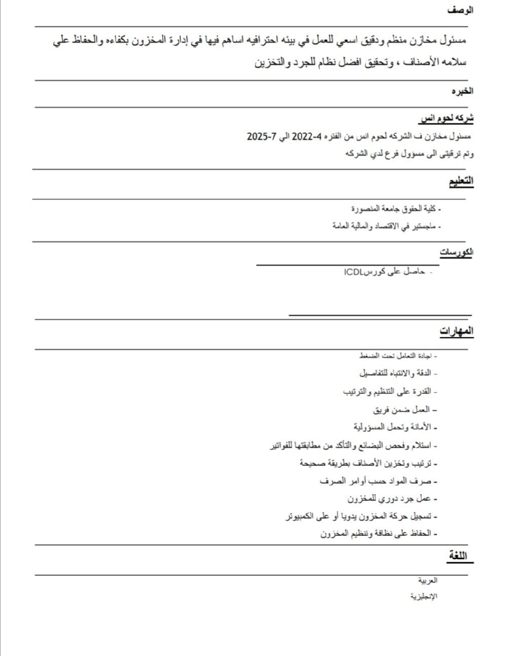 ابحث عن وظيفة أمين مستودع اشتغلت أمين مستودع لمدة سنتين اجادة التعامل تحت الضغط الدقة والانتباه للتفاصيل القدرة على التنظيم والترتيب العمل ضمن فريق الأمانة وتحمل المسؤولية استلام وفحص البضائع والتأكد من مطابقتها للفواتير - ترتيب وتخزين الأصناف بطريقة صحيحة صرف المواد حسب أوامر الصرف عمل جرد دوري للمخزون - تسجيل حركة المخزون يدويا أو على الكمبيوتر الحفاظ على نظافة وتنظيم المخزون