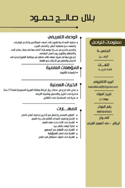 شاب يمني العمر 25 حسن المظهر والسلوك اشتغل كاشير في مطعم معجنات وبائع في محل بهارات وعطارة وحلويات واستقبال في فنادق وشاليهات إقامة سارية