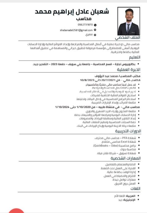 رئيس حسابات سوداني الجنسية خبرة أكثر من ثمان سنوات في اعداد الدورة المحاسبية ومراجعة واعتماد القيود اليومية والتسويات، اعداد ومراجعة القوائم المالية والتقارير الدورية للإدارة العليا، إدارة الأقفال الشهري والسنوي ومراجعة أرصدة الحسابات والمطابقات البنكية، اعداد اقرارات الزكاة وضريبة القيمة المضافة، تطبيق أنظمة الرقابة الداخلية وضمان سلامة الاجراءات المحاسبية، متابعة مراكز التكلفة بالفروع وتحليل النتائج
