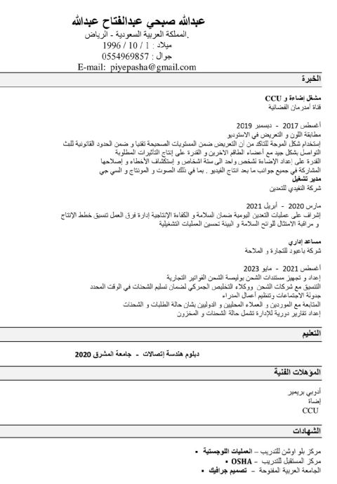 عبد الرحمن المنصور بكالوريوس تقنية معلومات، خبرات ادارية شؤون موظفين كاشير ادخال بيانات تسويق ومبيعات اشراف عمال جودة واتقان وتحمل ضغط العمل، إقامة ورخصة سارية