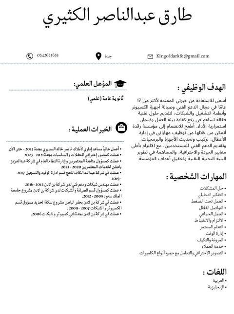 من مواليد مدينة جدة 1981م، ابحث عن عمل في أي مجال مناسب لسيرتي الذاتية. من سكان جدة ولا مانع لدي من العمل في الرياض أو الدمام أو الخبر أو المدينة المنورة. أنا انسان طموح ولدي القابلية للتعلم لأعمال ووظائف جديدة وقائد جيد للفريق وأحب الالتزام بالمواعيد والمهام، لدي اقامة ورخصة قيادة جار العمل على تجديدها، متزوج وأب ل 7 اطفال. أرجو الاطلاع على سيرتي الذاتية المرفقة