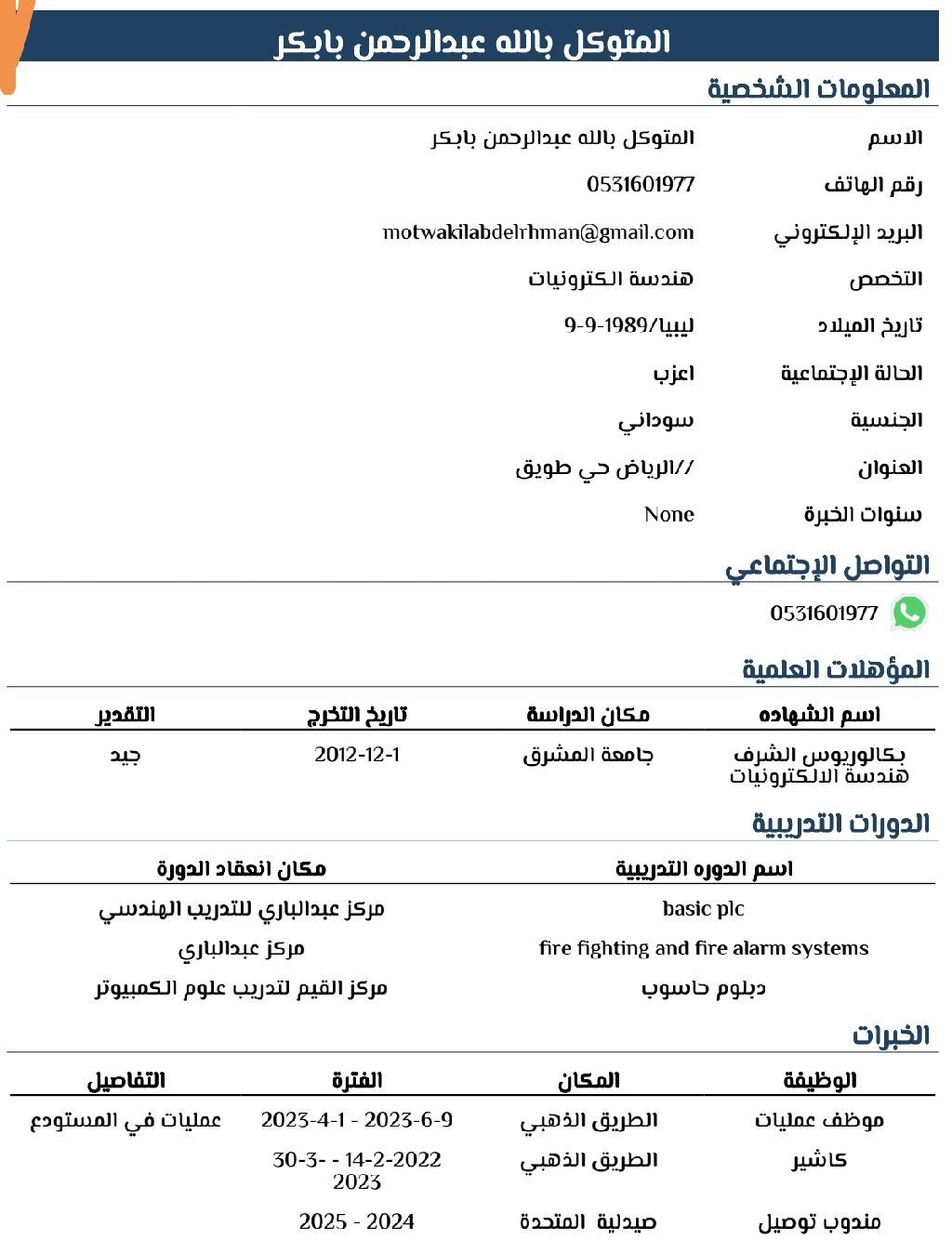 أنا الم توكل بالله عبد الرحمن سوداني الجنسية حائز علي بكالوريوس الهندسة الالكترونية من كلية المشرق في السودان ومتوفر رخصة سياقة سيارات سارية وابحث عن وظيفة