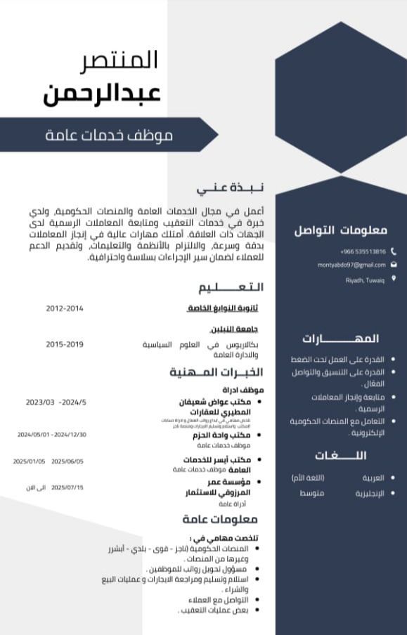 أنا المنتصر عبدالرحمن سوداني الجنسية اعمل في الخدمات الالكترونية مثل ناجز ابشر وقوى. الخ وابحث عن عمل