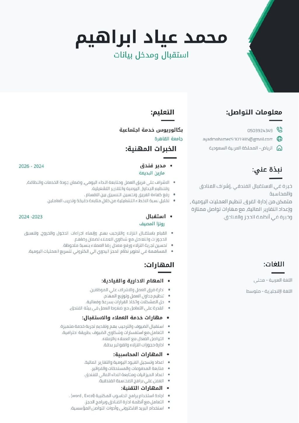 ابحث عن وظيفة (موظف استقبال فنادق) ذو خبرة وعلى دراية بالبرامج (نزيل بوكينج اكسبيديا اقودا جازر إن)