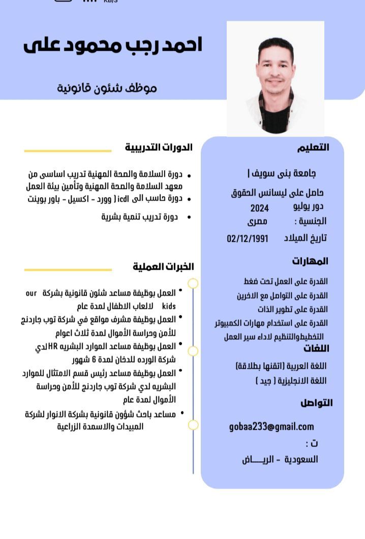 باحث عن عمل جاهز للعمل فورا شاب مصري مقيم في الرياض، حاصل على مؤهل عال، لدي خبرة في شؤون الموظفين وأجيد العمل المكتبي والتعامل مع العملاء. ابحث عن فرصة عمل مناسبة في أي مجال اداري أو مكتبي، ولا أمانع العمل بدون خبرة لاكتساب مهارة وتطوير نفسي. ملتزم وجاد سريع التعلم جاهز للعمل فورا للتواصل خاص