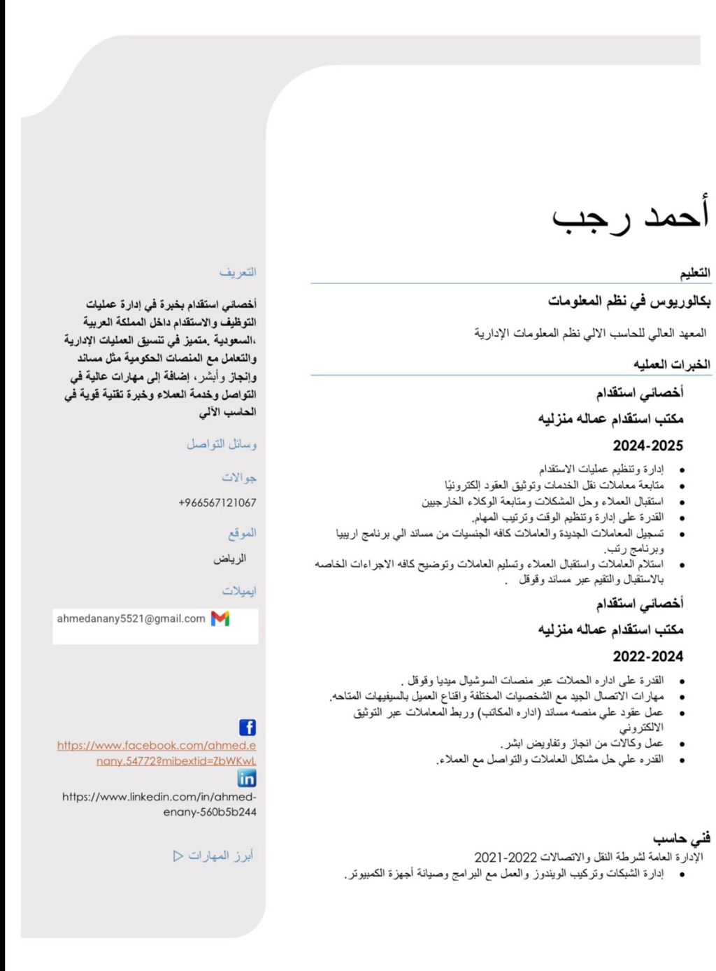 Recruitment Specialist/ Administrative Officer/ Data Entry - Proven Experience I am seeking a job opportunity in the field of recruitment or administrative work. strong knowledge of government platforms such as Musaned, Absher, and Qiwa. Key Responsibilities & Skills Managing and organizing recruitment operations I have hands - on experience working in recruitment offices and customer service, wit