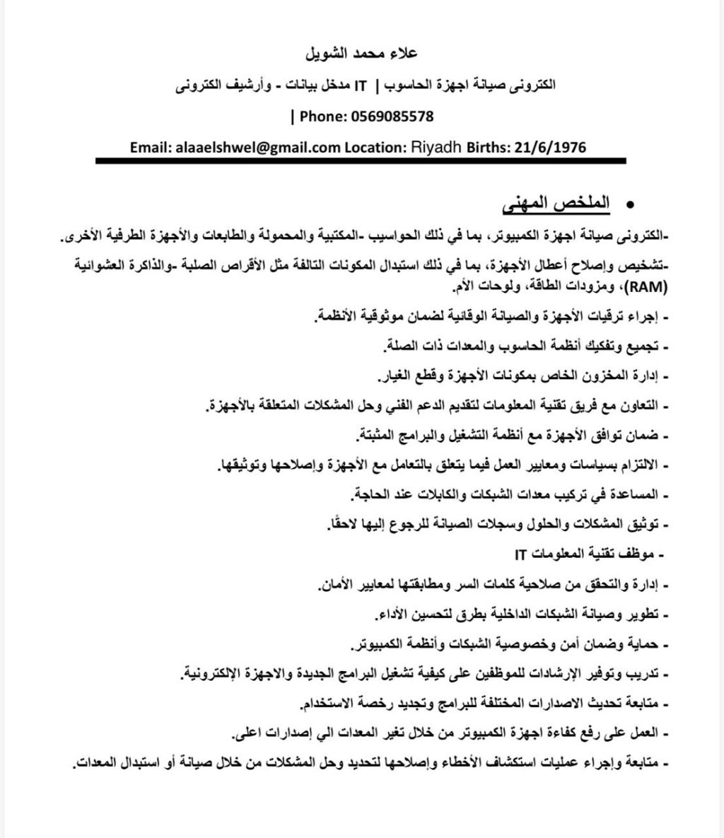 علاء محمد حاصل على ليسانس الحقوق فني حاسب الى ومدخل بيانات وأرشيف الكترواني 1 - سابقة عمل بشركة بالعليا في الرياض مسؤول عن عمل تثبيت نظام الويندوز وكافة البرامج وعمل الابجريت أو التعديلات على اجهزة الحاسب الجديدة رفع كفاءة الهارد دسك والرامات حسب متطلبات العميل 2 - سابقة عمل مدخل بيانات وأرشيف الكترواني لمدة 10 سنوات وعندى الخبرة في العمل الاداري والمكتبي 3 - سابقة عمل بشركة مقاولات عامة 4 - سابقة عمل بمكتب
