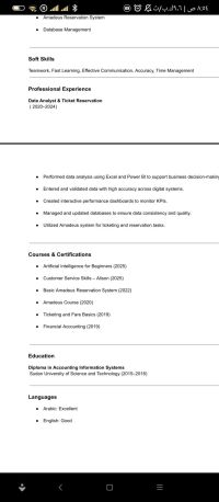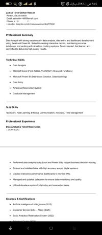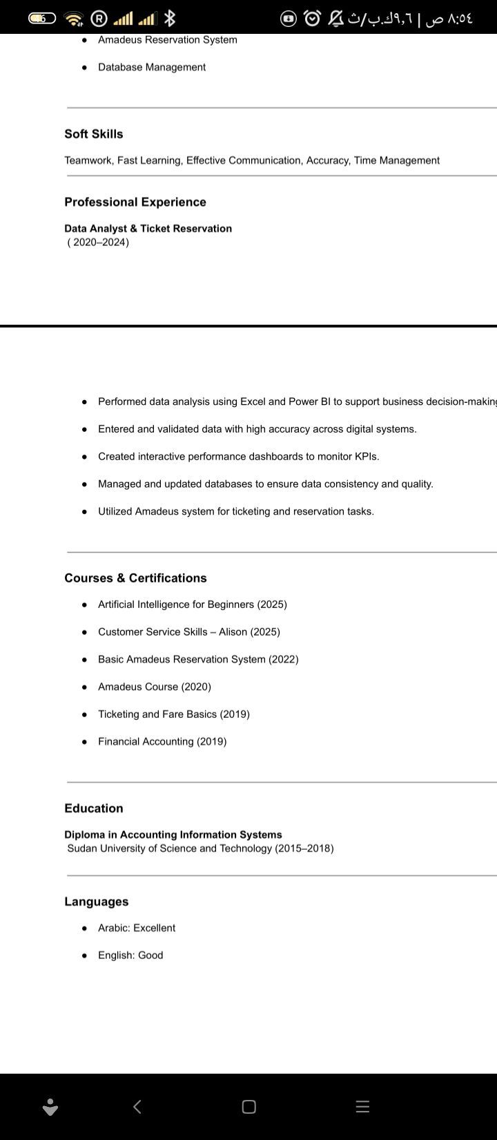 أنا أسكن في الرياض، سودانيه خريجة نظم معلومات محاسبية، وابحث عن فرصة عمل في أو تدريب في مجال ادخال وتحليل البيانات لدي خبرة في Excel وPower BI وإدارة قواعد البيانات. ومجال خدمة عملاء حاصلة على شهادة تدريبية (2025) وامتلك مهارات تواصل قوية. مستعدة للعمل فورا والالتزام التام. أو للتدريب