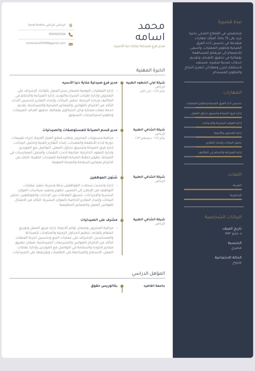 متخصص في إدارة وتشغيل المنشاءات الصحية بخبرة تمتد لعدة سنوات في الاشراف على الصيدليات وفرق العمل وتطوير الأداء التشغيلي وتحسين جودة الخدمات المقدمة. امتلك قدرة عالية على إدارة العمليات اليومية وضبط التكاليف وتحليل البيانات لدعم اتخاذ القرار مع الالتزام بالمعايير الصحية والتنظيمية. أسعى دائما الى تحقيق نتائج مستدامة وتعزيز كفاءة بيئة العمل بما يدعم نمو المؤسسة ورضا العملاء