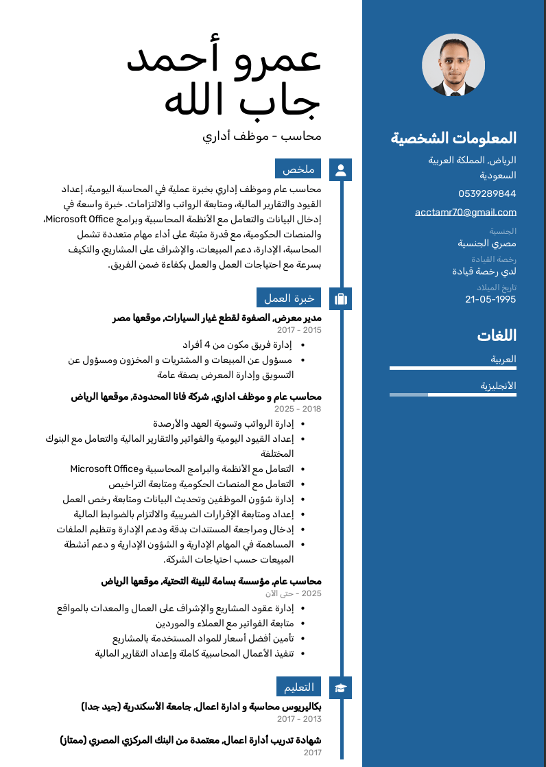 عندي خبرة 8 سنوات متنوعة في المحاسبة، الشؤون الادارية، الموارد البشرية، المنصات الحكومية، وإدارة مواقع العمال والمعدات وعملت سابقا في مجالات مختلفة منها المقاولات والنقليات والتصنيع والعقارات والمزادات. أتميز بالمرونة وتعدد المهارات، ويمكنني العمل في أي مجال تحتاجه الشركة بما يخدم أهدافها ويساهم في تطوير الأداء