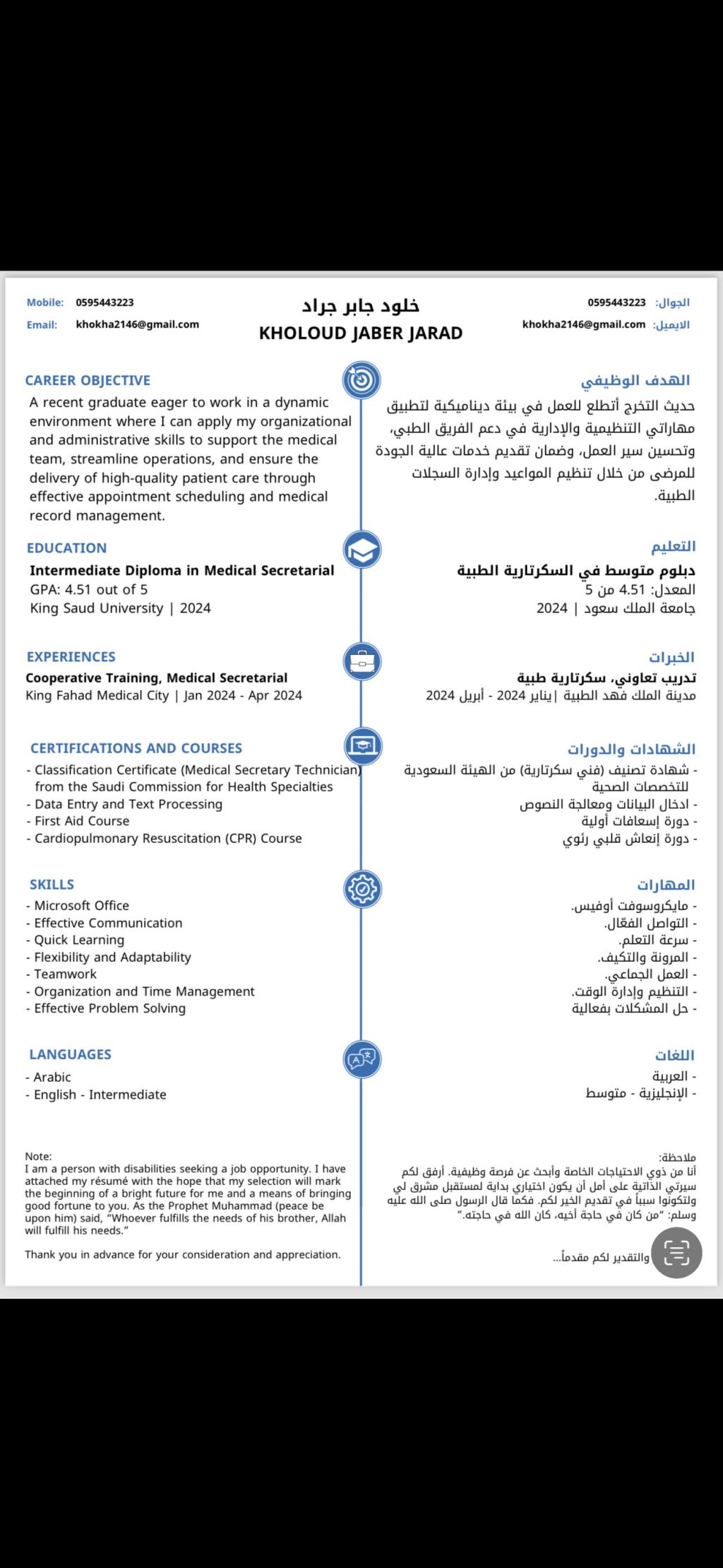 أنا من ذوي الاحتياجات الخاصة وابحث عن فرصة عمل عن بعد في بيئة داعمة ومحفزة. لدي القدرة على الالتزام وتحمل المسؤولية، وأجيد استخدام الحاسب والأنظمة المكتبية، ومستعدة للتعلم والتطوير