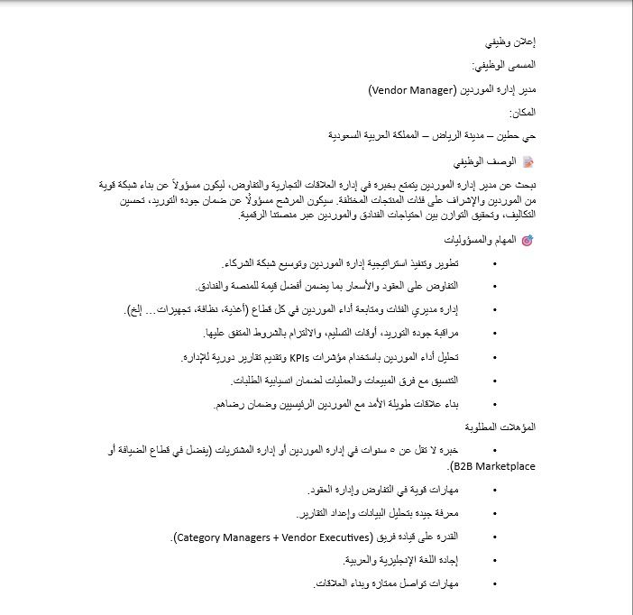 نبحث عن مدير إدارة الموردين يتمتع بخبرة في إدارة العلاقات التجارية والتفاوض، ليكون مسؤولا عن بناء شبكة قوية من الموردين والاشراف على فئات المنتجات المختلفة. سيكون المرشح مسؤولا عن ضمان جودة التوريد، تحسين التكاليف، وتحقيق التوازن بين احتياجات الفنادق والموردين عبر منصتنا الرقمية