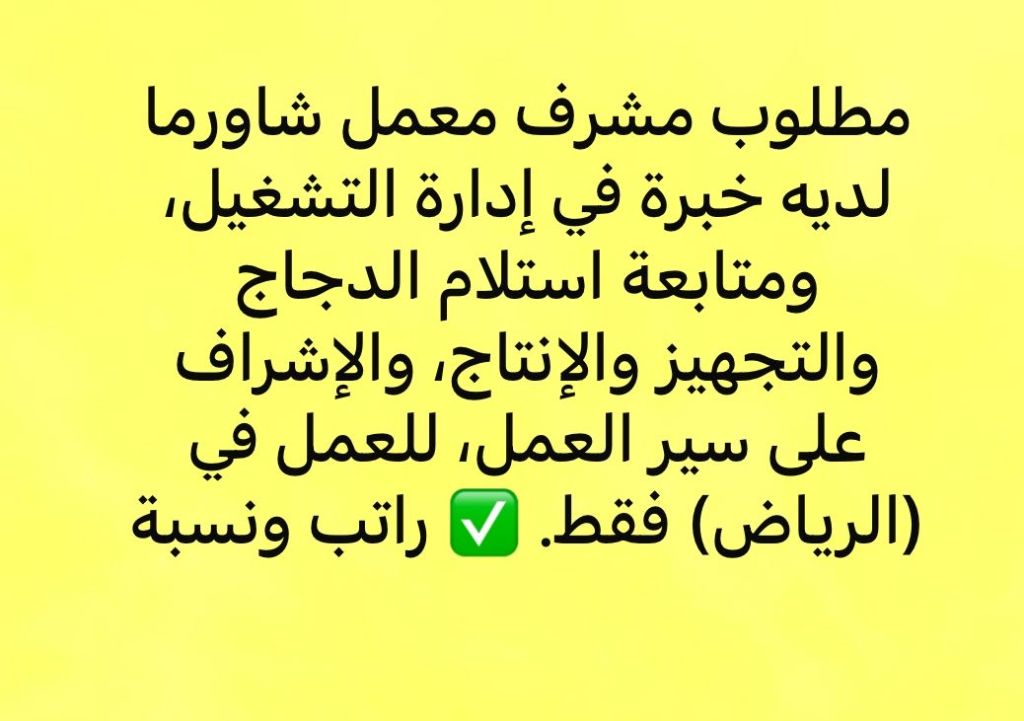مطلوب مشرف معمل شاورما لديه خبرة في إدارة التشغيل، ومتابعة استلام الدجاج والتجهيز والانتاج، والاشراف على سير العمل، للعمل في (الرياض) فقط، راتب ونسبة