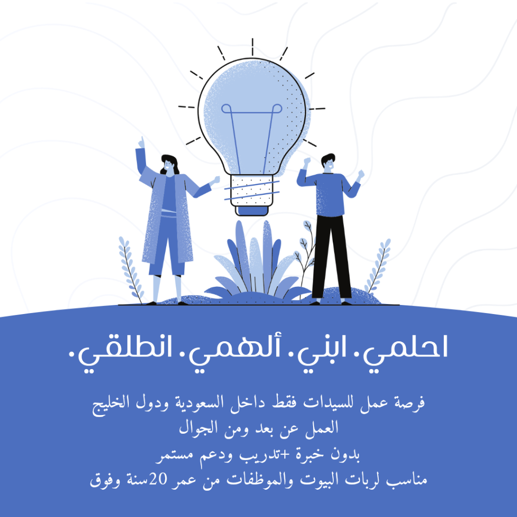 فرصة عمل عن بعد للسيدات نقدم برنامج عمل نسائي مرن يدار بالكامل من الجوال، مناسب لمن تبحث عن عمل اضافي أو تطوير مسارها المهني من المنزل وبأوقات مرنة. العمل يتم عن بعد 100% يعتمد على نظام عمل منظم ضمن فريق نسائي مناسب للموظفات وربات المنازل والطالبات لا يشترط خبرة سابقة العمر من 20 سنة فما فوق الفرصة متاحة داخل السعودية ودول الخليج فقط يشترط الجدية والالتزام والرغبة بالتعلم والتطور. التواصل