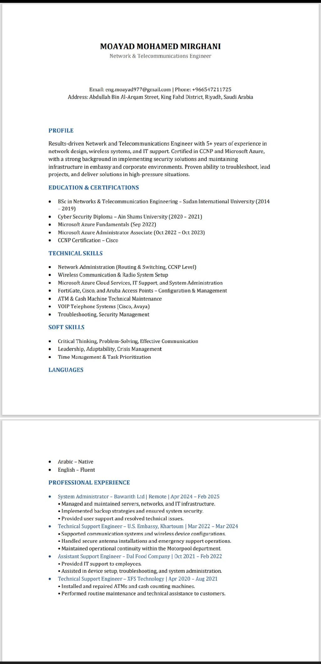 I am Moayad Mohammed, a Network Engineer with over 4 years of experience in the field. I specialize in Networking Engineering, Fortinet Firewall, IP Office, and Cisco. I hold a CCNP certification from Cisco and an Azure certification from Microsoft. Please feel free to contact