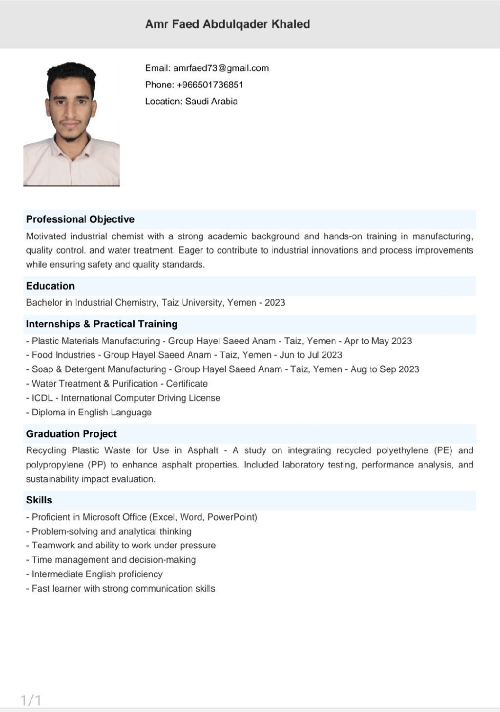 خريج بكالوريوس كيمياء صناعية، ابحث عن فرصة عمل مناسبة في مجال تخصصي أو في المجالات ذات الصلة. لدي شهادات تدريب عملية في مصانع، مما اكسبني خبرة جيدة في بيئة العمل الصناعي. امتلك مهارات جيدة في استخدام برامج الحاسوب، اكسل اكسس وورد بالاضافة الى دبلوم لغة انجليزية، مما يساعدني على التعامل مع المستندات والتقارير الفنية. أتمتع بروح العمل الجماعي والجدية في أداء المهام وأسعى للتطوير المستمر
